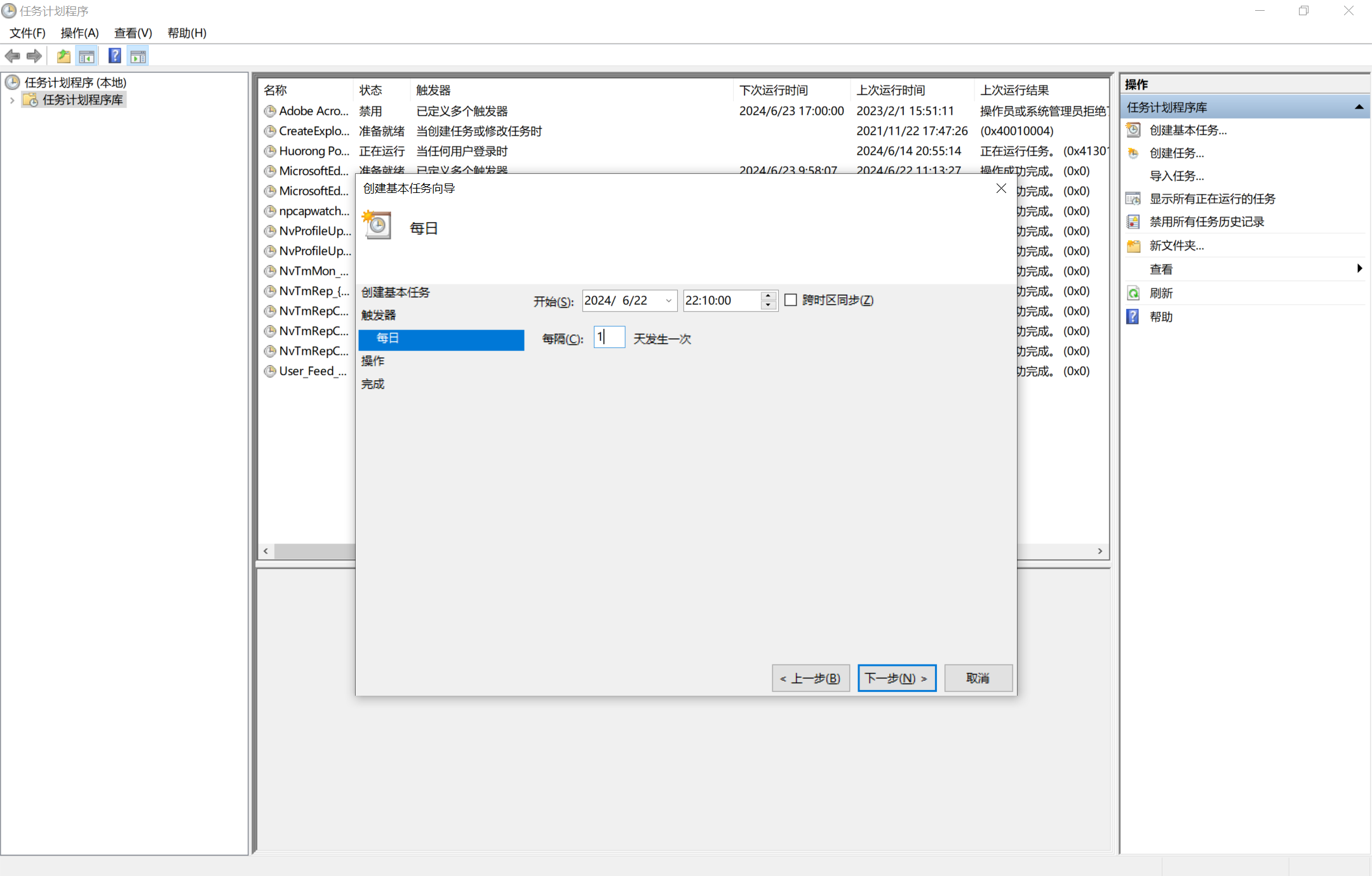 设置任务的执行时间,选择“每天”,并设置具体执行的时间。