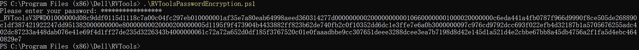 运行 RVToolsPasswordEncryption.ps1 脚本后,输入 ESXi 主机或 vCenter 的登录密码完成加密,得到输出加密后的密码。