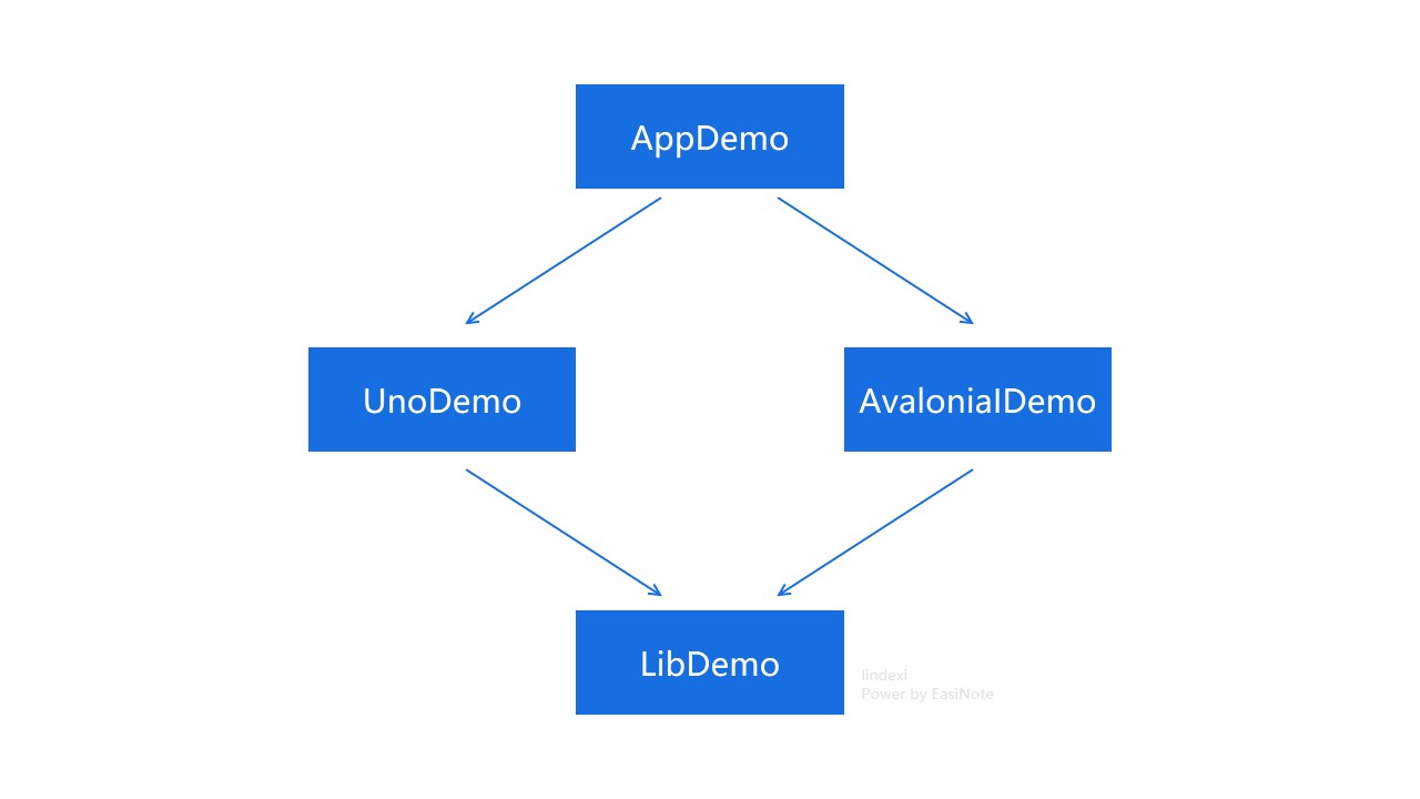 现在 UnoDemo 和 AvaloniaIDemo 项目相互之间不引用,为了能够间接调用到,就需要让两个项目都依赖抽象