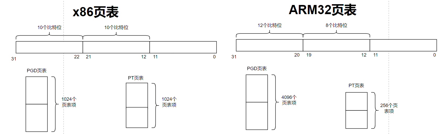 ARM的PGD是从bit20 ~ bit31,总共12bit, 4096页表项。PT域从bit12 ~ bit 19,总共8bit,2556页表项。