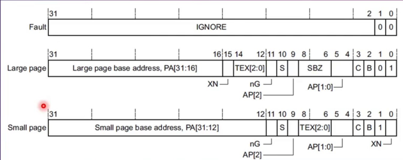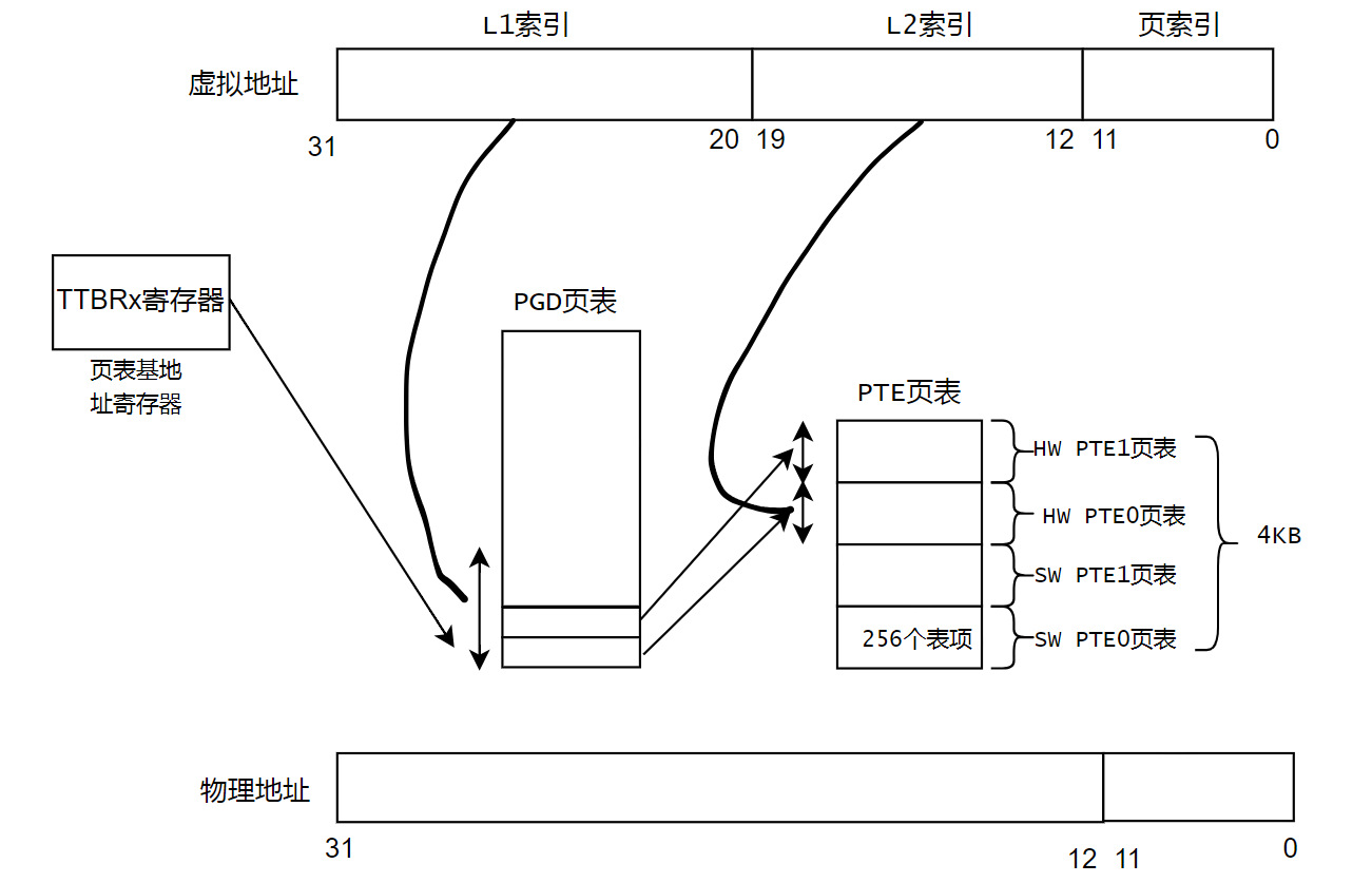 虚拟地址的32个bit位可以分为3个域,最高12bit位20~31位称为L1索引,叫做PGD,页面目录。中间的8个bit位叫做L2索引,在Linux内核中叫做PT,页表。最低的12位叫做页索引。