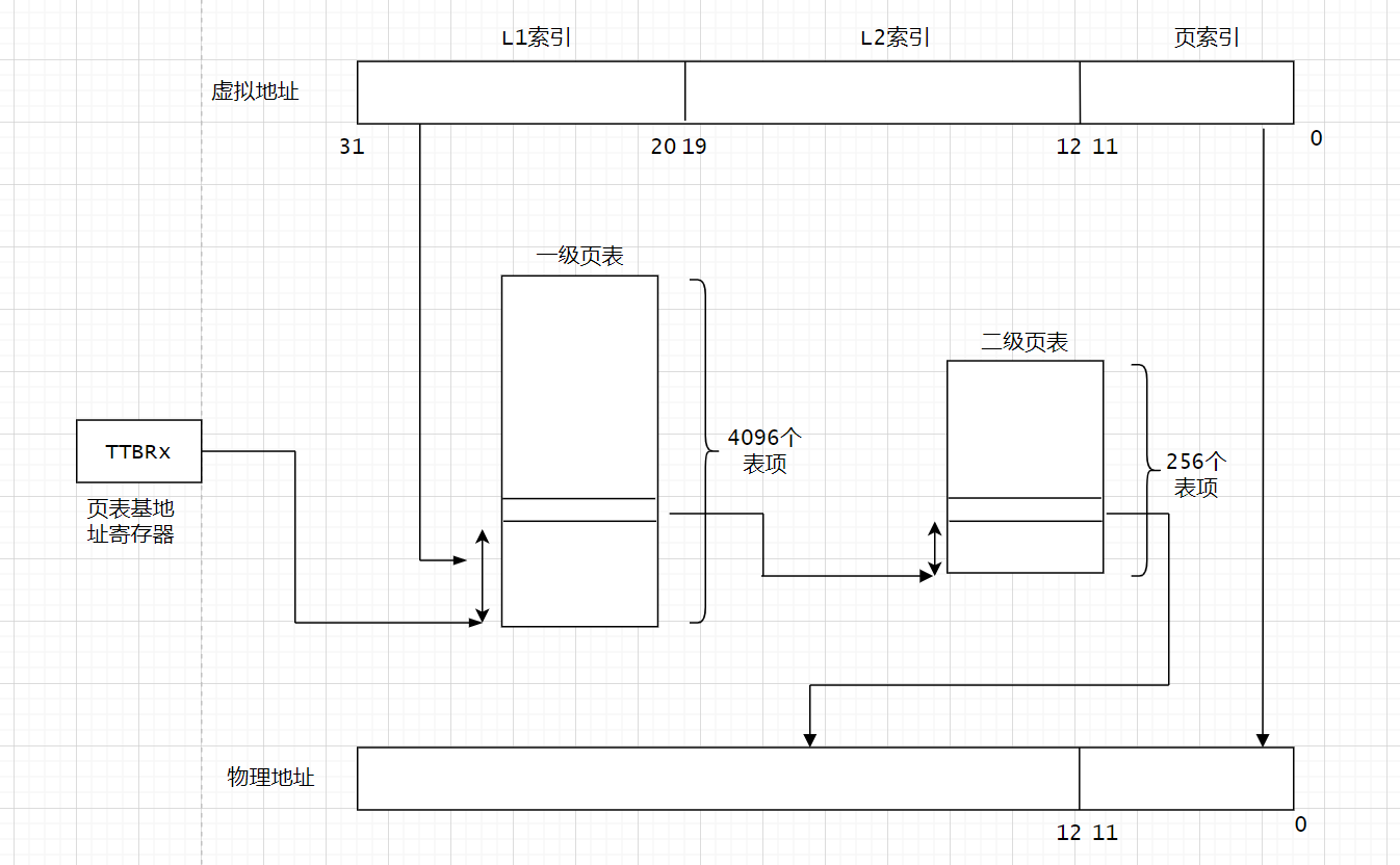 在ARM处理器中,TTBRx寄存器存放着页表基地址,我们这里的一级页表有4096个页表项。每个表项中存放着二级表项的基地址。我们可以通过虚拟地址的L1索引访问一级页表,访问一级页表相当于数组访问。
