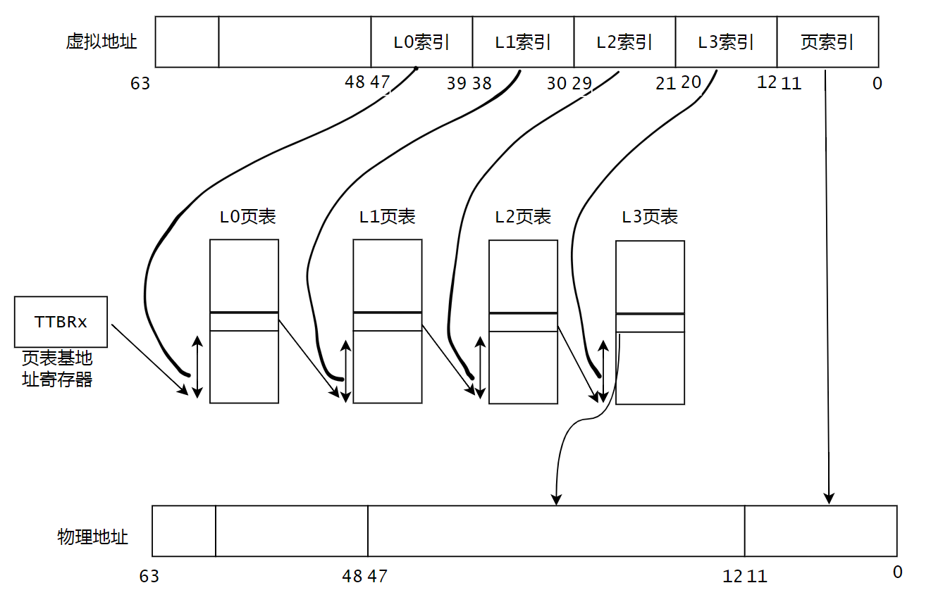 假设页表基地址为TTBRx,访问页表基地址就能访问到L0页表的基地址,可以使用L0索引的值作为offset去访问L0页表。