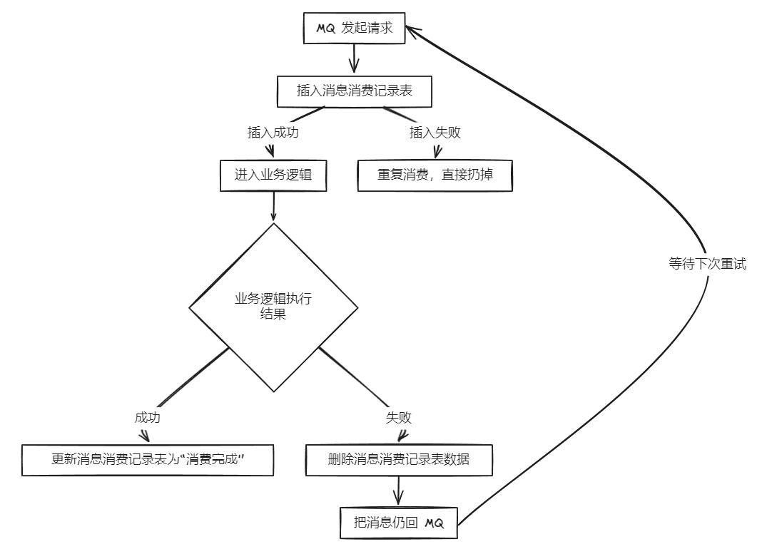 if(保存数据到消息消费记录表){//出现主键冲突就返回false