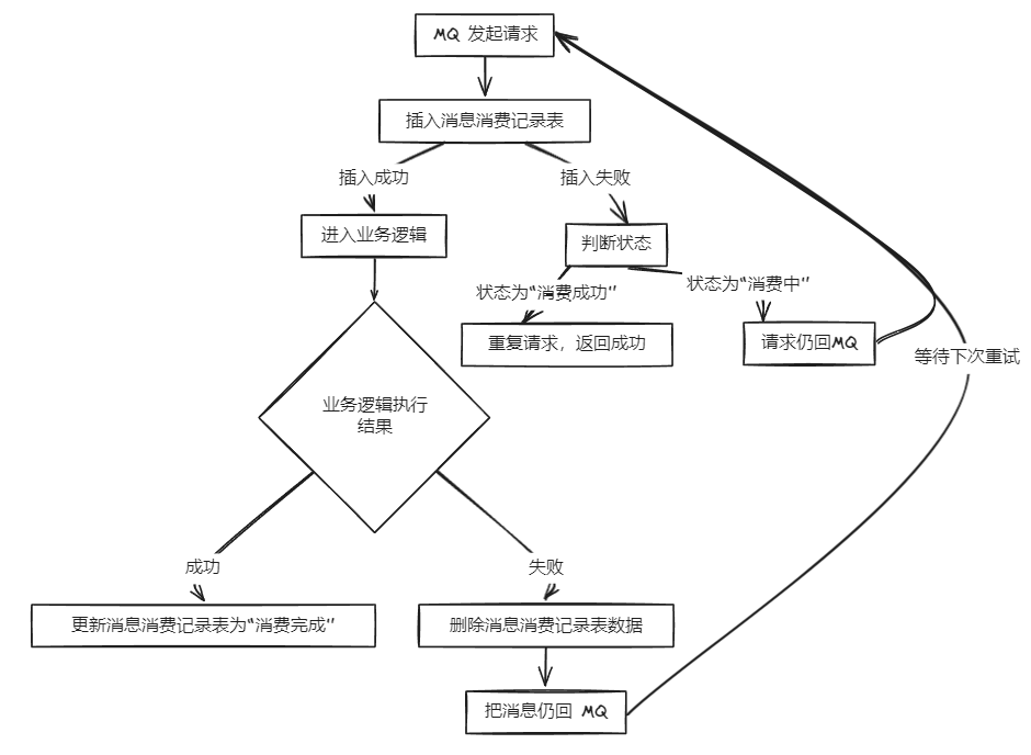 面试官拿着你的流程图,看了一眼,立马就看出了一个问题:如果一个消息插入失败,你的逻辑是扔掉。那假设这条消息的状态是消费中,业务逻辑执行失败,是不是应该重新消费才对呢?