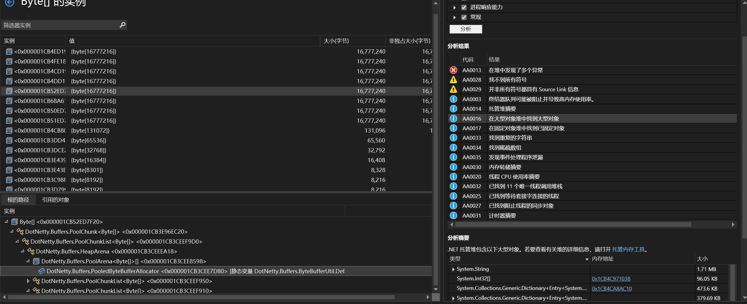 对于客户反应后,告诉客户把dump发过来,然后通过dump分析发现是DotNetty.Buffers.PooledByteBufferAllocator 分配堆内存未进行释放