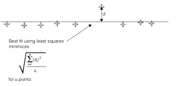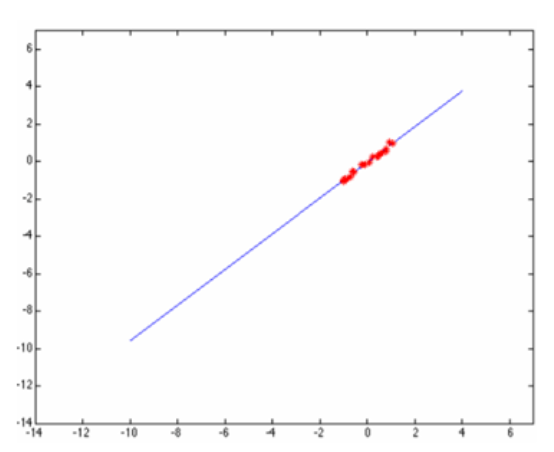 直线拟合的原理很简单,就是给出多个点,然后根据这些点拟合出一条直线,最常见的算法是多约束方程的最小二乘拟合,如下图所示: