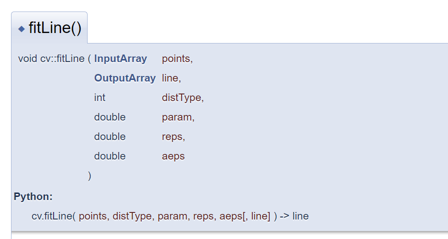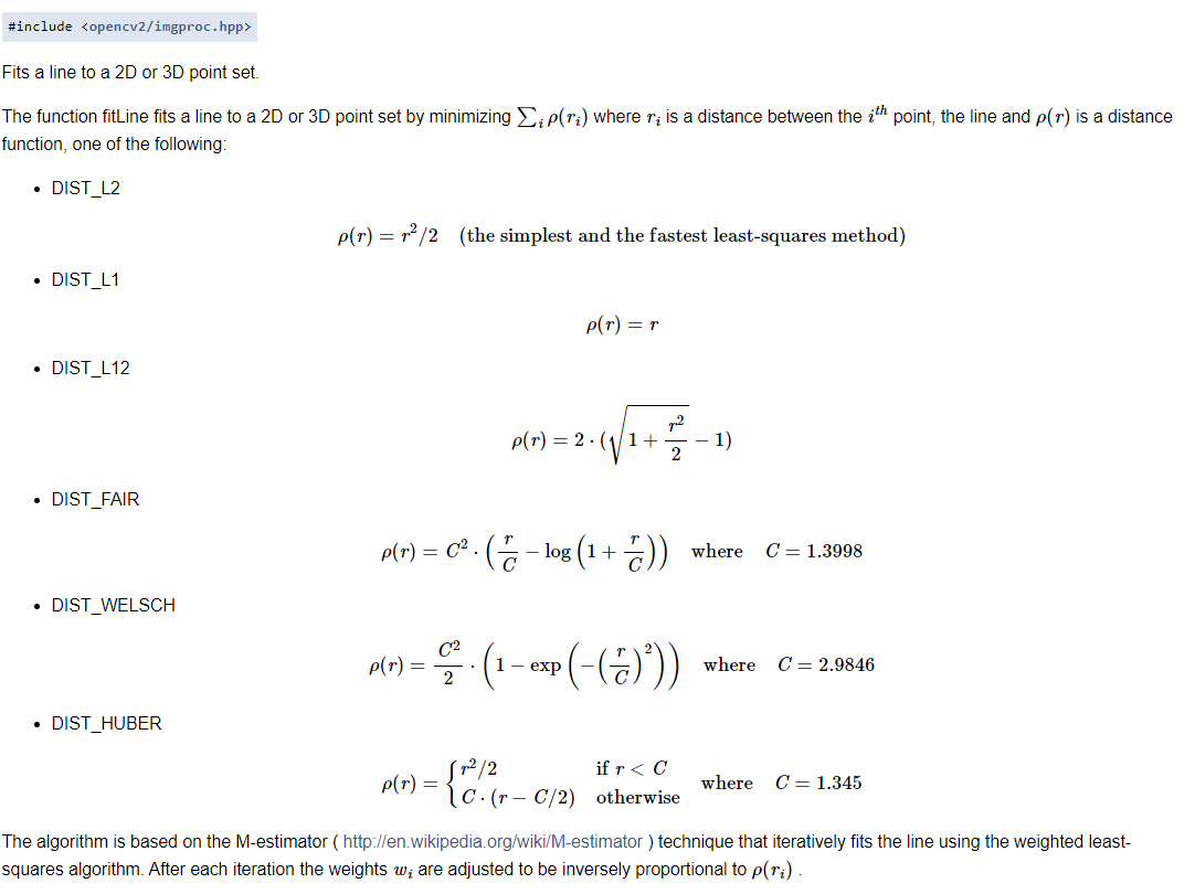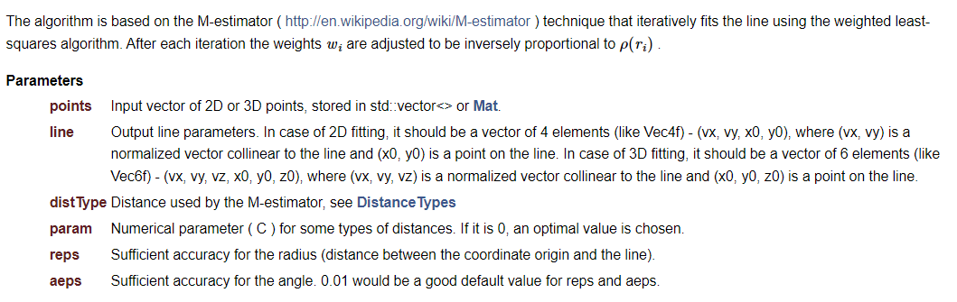 下图是OpenCV官方文档中,对直线拟合函数的详细介绍,这个可以好好分析,毕竟是开源的哈。