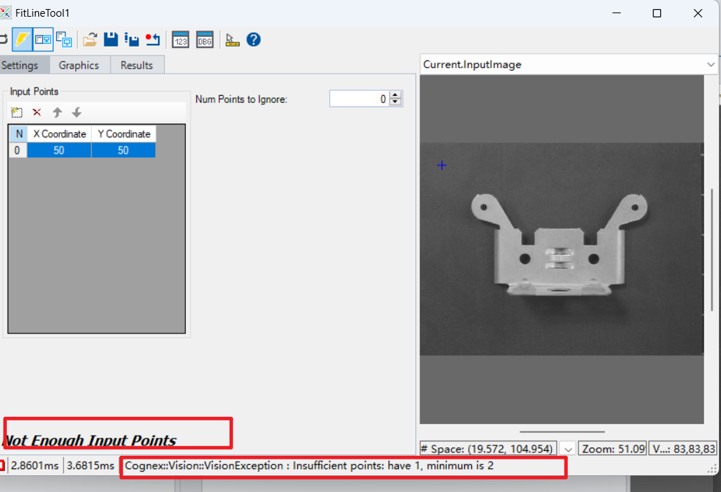 下图展示了只输入一个点,FitLineTool的报错情况: