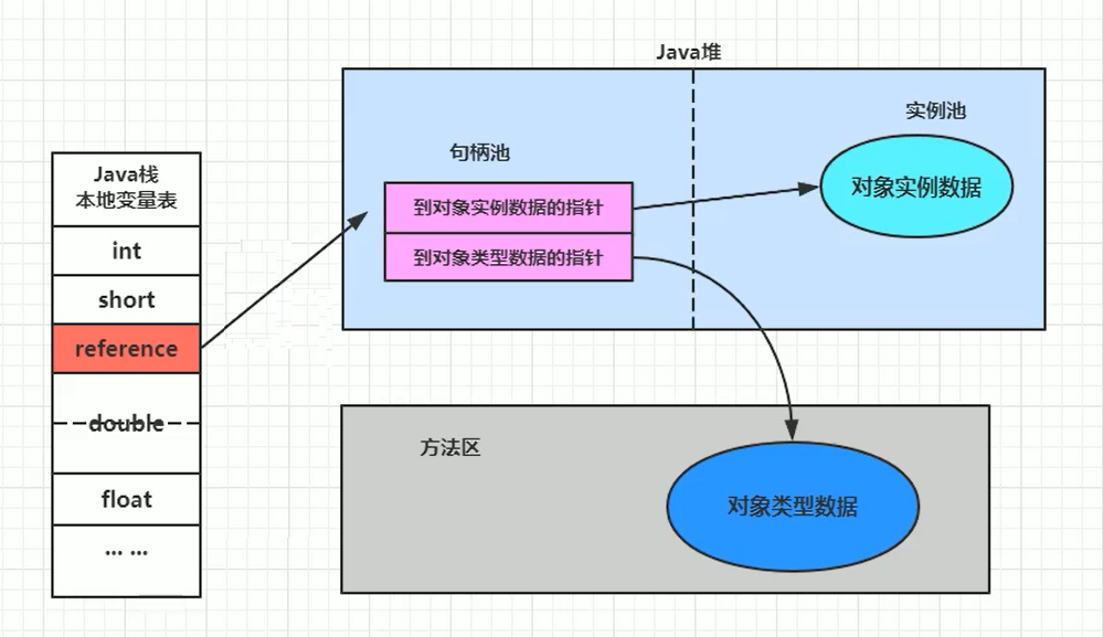 句柄访问就是说栈的局部变量表中,记录的对象的引用,然后在堆空间中开辟了一块空间,也就是句柄池。reference中存储的就是对象的句柄地址,而句柄中包含了对象实例数据与类型数据各自具体的地址信息。