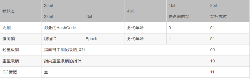 例如:在32位的HotSpot虚拟机中,如对象未被同步锁锁定的状态下,Mark Word的32个比特存储空间中的25个比特用于存储对象哈希码,4个比特用于存储对象分代年龄,2个比特用于存储锁标志位,1个比特固定为0,在其他状态(轻量级锁定、重量级锁定、GC标记、可偏向)下对象的存储内容如下图所示: