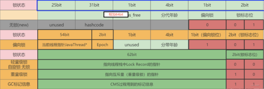 用于存储自身的运行时数据,如哈希码(HashCode)、GC分代年龄、锁状态标志、线程持有的锁、偏向线程ID、偏向时间戳等,这部分的数据的长度在32位和64位的虚拟机(未开启压缩指针)中分别为32个比特和64个比特,称它为“Mark Word”。