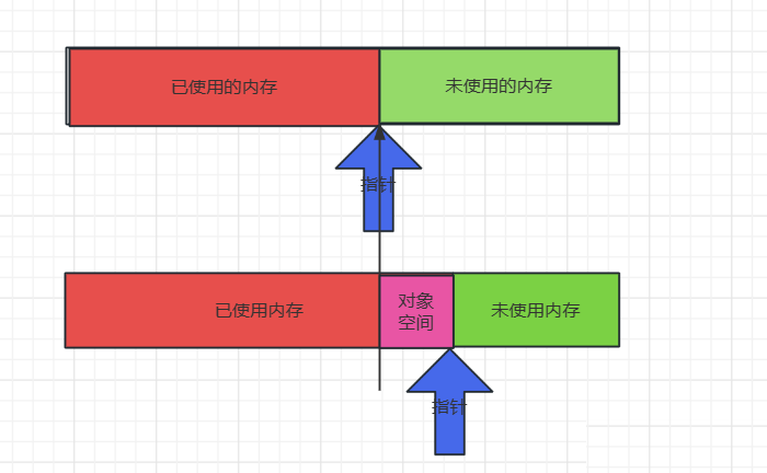 如果内存是规整的,那么虚拟机将采用的是指针碰撞法(Bump The Point)来为对象分配内存。意思是所有用过的内存在一边,空闲的内存放另外一边,中间放着一个指针作为分界点的指示器,分配内存就仅仅是把指针指向空闲那边挪动一段与对象大小相等的距离罢了。