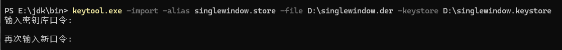 keytool.exe -import -alias singlewindow.store -file D:\singlewindow.der -keystore D:\singlewindow.keystore