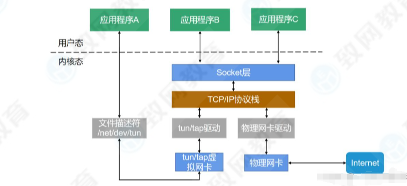 在使用上面,两者都是通过字符设备的方式进行读取和写入,Tun是三层网络设备,而Tab是二层网络设备,Tun常用于VPN等技术,由于工作在IP层,无法与物理网卡做bridge,但可以通过三层交换(如 ip_forward)与物理网卡连通,Tab设备工作在第二层,收发的是MAC层数据包,拥有MAC层的功能,可以与物理网卡做bridge,支持MAC层广播