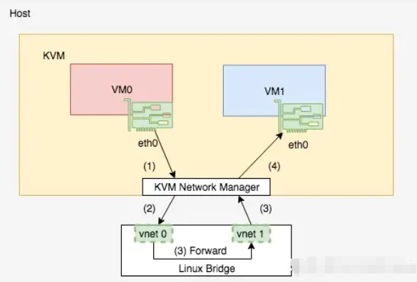 TAP接口的典型应用场景是在虚拟化网络中。例如,我们通过KVM创建的多个VM(虚拟机),以LinuxBridge(桥接网络)互通;实际上即是通过像vnet0这样的TAP接口来接入LinuxBridge的。在这种场景下,KVM程序就是向TAP接口读写数据的用户空间程序。当VM0向本机的eth0接口发送数据,KVM会将数据发送到TAP接口vnet0,再通过LinuxBridge将数据转发到vnet1上。然后,KVM将数据发送到VM1的eth0口。
