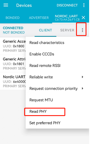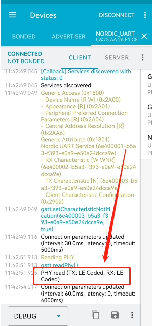 点击连接,然后点击右边3个竖着的点,在点击读取 PHY(read PHY),在右向滑动窗口到log显示界面,确定连接是否也是coded,