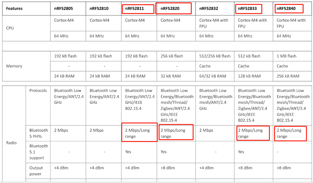 下面是支持long range的芯片截图,当然除去下面这些,还有nrf5340也是支持的