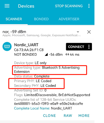 使用带有拓展广播扫描功能的手机,安装nrf connect app后,使用名字过滤后可以看到我们的lonog range广播,特别注意,有些手机不支持拓展广播,可能无法找到: