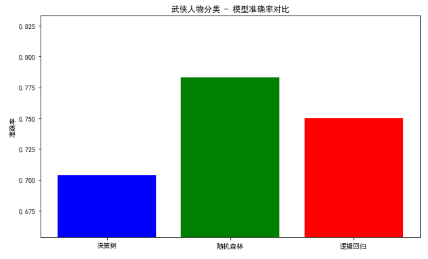 在这个示例中,我们首先创建了一个分类问题的数据集,代表了武侠人物在“内力”和“武功等级”两个方面的表现,并将这些人物分类为正派和邪派。然后,我们使用了三种不同的机器学习模型:决策树、随机森林、逻辑回归来进行分类,并计算了它们的准确率。通过可视化模型准确率对比和特征分布图,我们可以直观地看到不同模型的性能以及武侠人物在这两个特征空间上的分布情况。