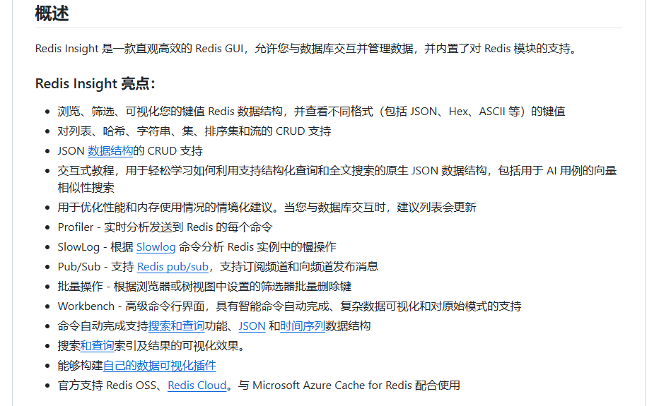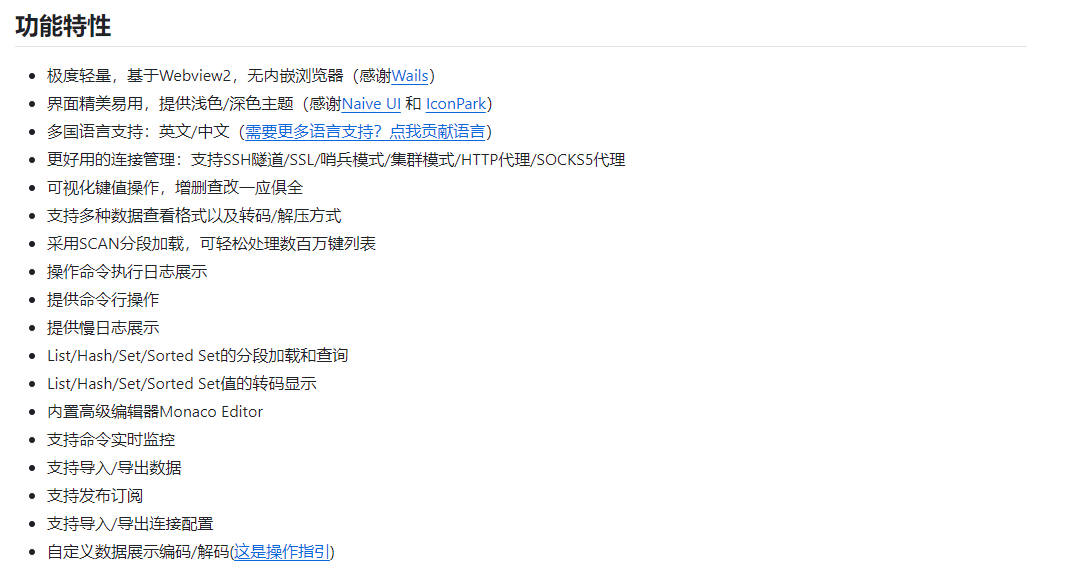该工具是官方提供的免费工具,同样支持跨平台,支持Windows、Liunx和Mac。该工具功能全面,自称是最好的Redis桌面管理工具,支持对数据的查询、分析及交互。下图是其功能亮点。