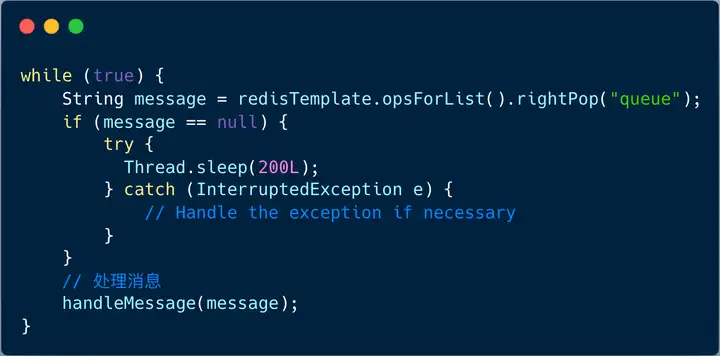 上图的伪代码中, while(true) 循环内不停地调用 RPOP 指令,当有消息时,可以及时处理,但假如没有读取到消息,则需要休眠一会。