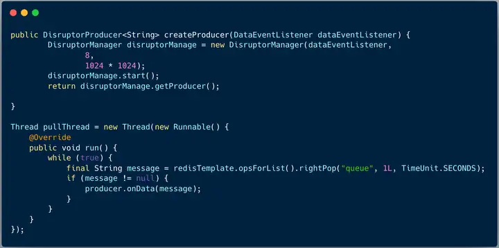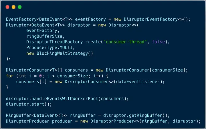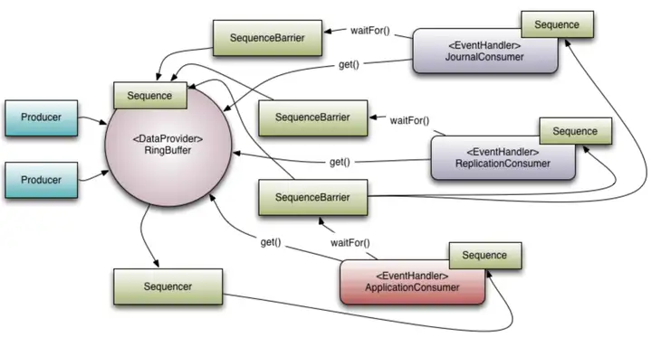 和线程池机制非常类似, Disruptor 也是非常典型的生产者/消费者模式。线程池存储提交任务的容器是阻塞队列,而 Disruptor 使用的是环形缓冲区 RingBuffer。