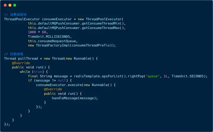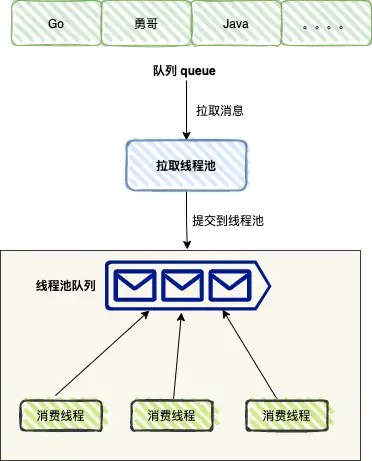 为了提升消费速度,我们可以将拉取和消费拆分成两种动作,分别通过不同的线程池来处理。拉取线程池负责拉取消息,消费线程池负责消费消息。