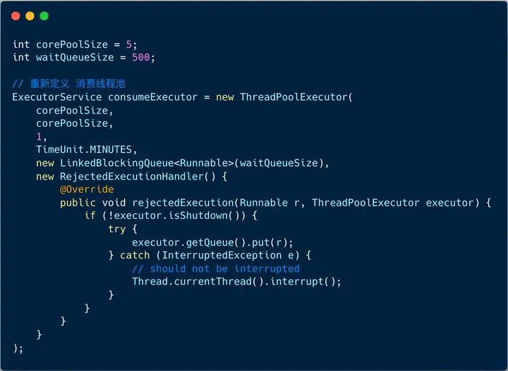 我们将消息包装为 Runnable ,然后通过消费线程池执行 execute ,拉取线程会不会阻塞呢 ?