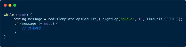 我们启动一个独立的线程从队列中读取消息(RPOP 命令),读取成功之后,消费消息,若没有消息,则休眠一会,下一次循环再继续。