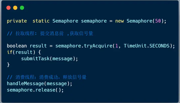答案是:拉取线程提交消息到线程池时,当队列中消息数量到达一定数量时,提交消息到线程池会阻塞。