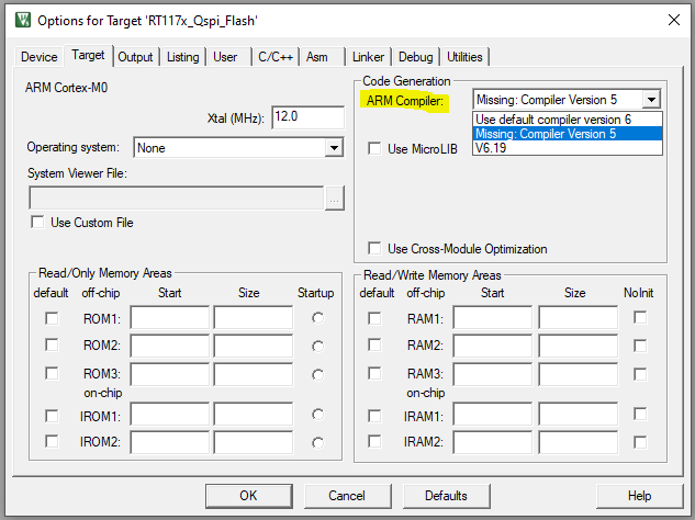 随便打开一个 MDK 工程,在工程选项 Target / ARM Compiler 里能看到当前已安装的所有编译器版本,痞子衡当前的 MDK v5.38 里仅有一个默认的 Arm Compiler 6 (具体版本是 6.19),这里也同时显示了 Arm Compiler 5 选项,但是状态是 Missing,即不可用状态。