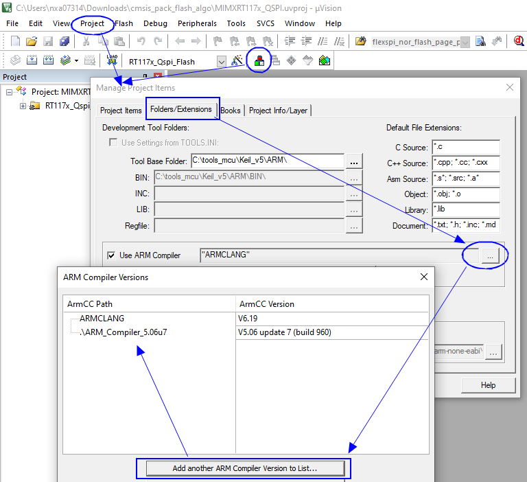 编译器补丁安装完成后,打开 MDK,进入菜单栏 Project / Manage / Project Items 配置,切换到 Folders/Extensions 选项卡,按如下操作将 Arm Compiler 5.06u7 加入到编译器列表(单击 Add another ARM Compiler Version to List 时选择 \Keil_v5\ARM\ARM_Compiler_5.06u7 路径识别)。