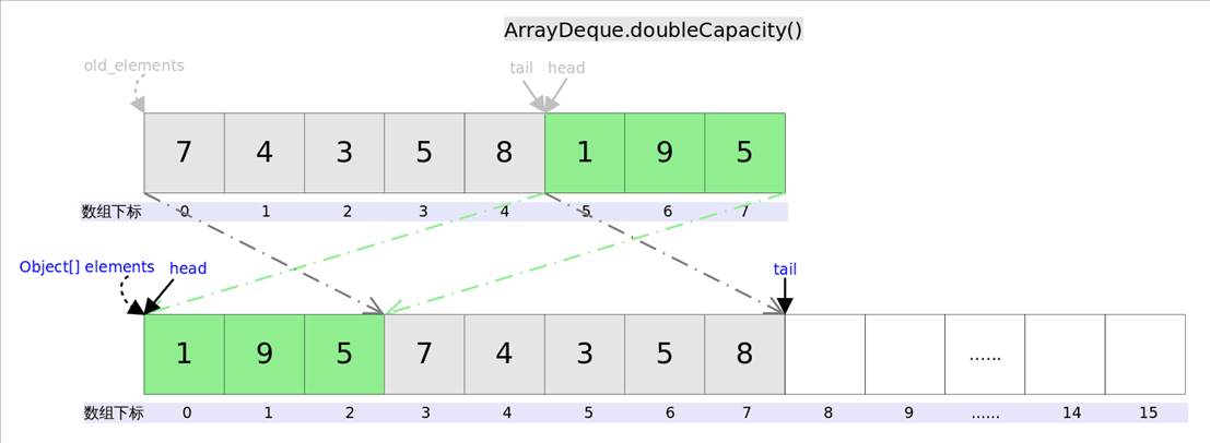 扩容函数doubleCapacity(),其逻辑是申请一个更大的数组(原数组的两倍),然后将原数组复制过去。过程如下图所示:
