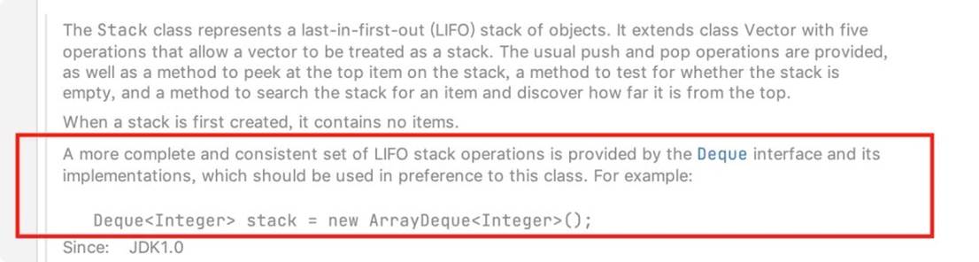 JDK 官方是不推荐使用 Stack,之所以还有很多人在使用,是因为 JDK 并没有加 deprecation 注解,只是在文档和注释中声明不建议使用,但是很少有人会去关注其实现细节