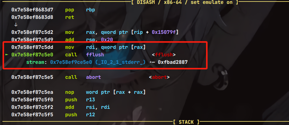 可以看见__malloc_assert调用了__fxprintf和fflush,而这个函数调用后会调用_IO_file_jumps中的sync指针。