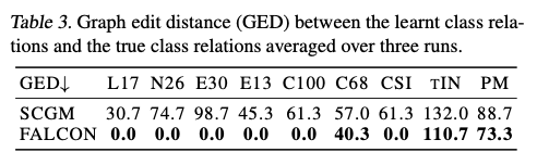 在这里, \(\mathcal{P}(\mathcal{Y}_\text{f})\) 是所有细粒度类别标签的排列组合。在实践中,可以使用匈牙利算法高效地计算该度量。此外,我们还报告了调整兰德指数(ARI)。由于FALCON还学习了类别关系,我们使用图编辑距离(GED)报告了学习到的标签关系与地面真相图之间的差异。图编辑距离计算必须添加或移除的节点和边的数量,以使其匹配目标图。