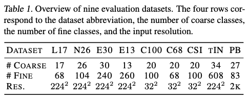具体来说,设 \(\mathcal{D}_l = \{(\mathbf{x}^i, y_c^i)\}_{i=1}^{N_l}\) 是一个数据集,其中 \(\mathbf{x}^i \in \mathcal{X}\) , \(y_c^i \in \mathcal{Y}_C^l\) ,而 \(\mathcal{Y}_C^l\) 是数据集特定的粗粒度类别集合。假设每个数据集 \(\mathcal{D}_l\) 的样本都可以与共享的细粒度类别集合 \(\mathcal{Y}_F\) 中的细粒度类别关联,将来自 \(D\) 个数据集的样本合并为一个组合数据集 \(\mathcal{D}_\text{all}\) :