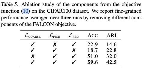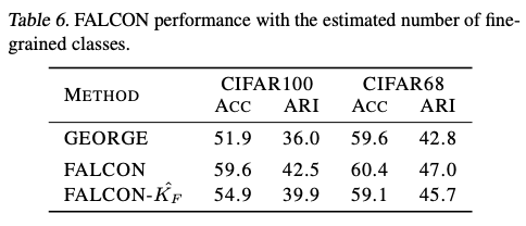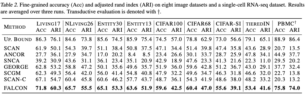 在没有细粒度基准标签的情况下训练了FALCON和基线模型。因此,报告细粒度聚类准确度作为评估指标。