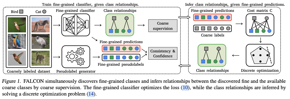 在这项工作中,论文提出了一种名为FALCON(Fine grAined Labels from COarse supervisioN)的方法,它可以在一个粗标记的数据集中发现细粒度类别,并且无需任何监督。FALCON的关键发现是,细粒度预测可以通过结合粗粒度和细粒度类别之间的关系来恢复粗粒度预测。基于这个发现,FALCON开发了一个专门的优化过程,交替进行推断粗粒度和细粒度类别之间的未知关系和训练细粒度分类器。粗粒度和细粒度类别之间的关系是通过解决一个离散优化问题来推断的,而细粒度分类器则使用粗粒度监督和细粒度的伪标签进行训练。此外,FALCON可以无缝地适应和利用具有多个数据集的不兼容粗粒度类别,并以相同的细粒度级别重新标记。