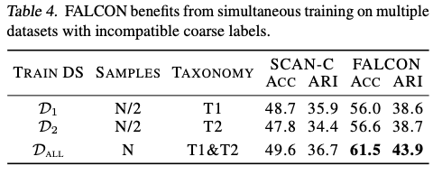 细粒度类别可以以不同的方式被分组成粗粒度类别。例如,可以根据饮食习性(食肉动物与杂食动物)、体型大小(小型与大型)或生物分类学(Canis lupus与Canis familiaris)对动物进行分组。因此,尽管对相同细粒度类别的实例进行了聚合,但数据集往往具有不同的标签。FALCON可以无缝地应用于在具有不同粗粒度标签的多个数据集上的训练。