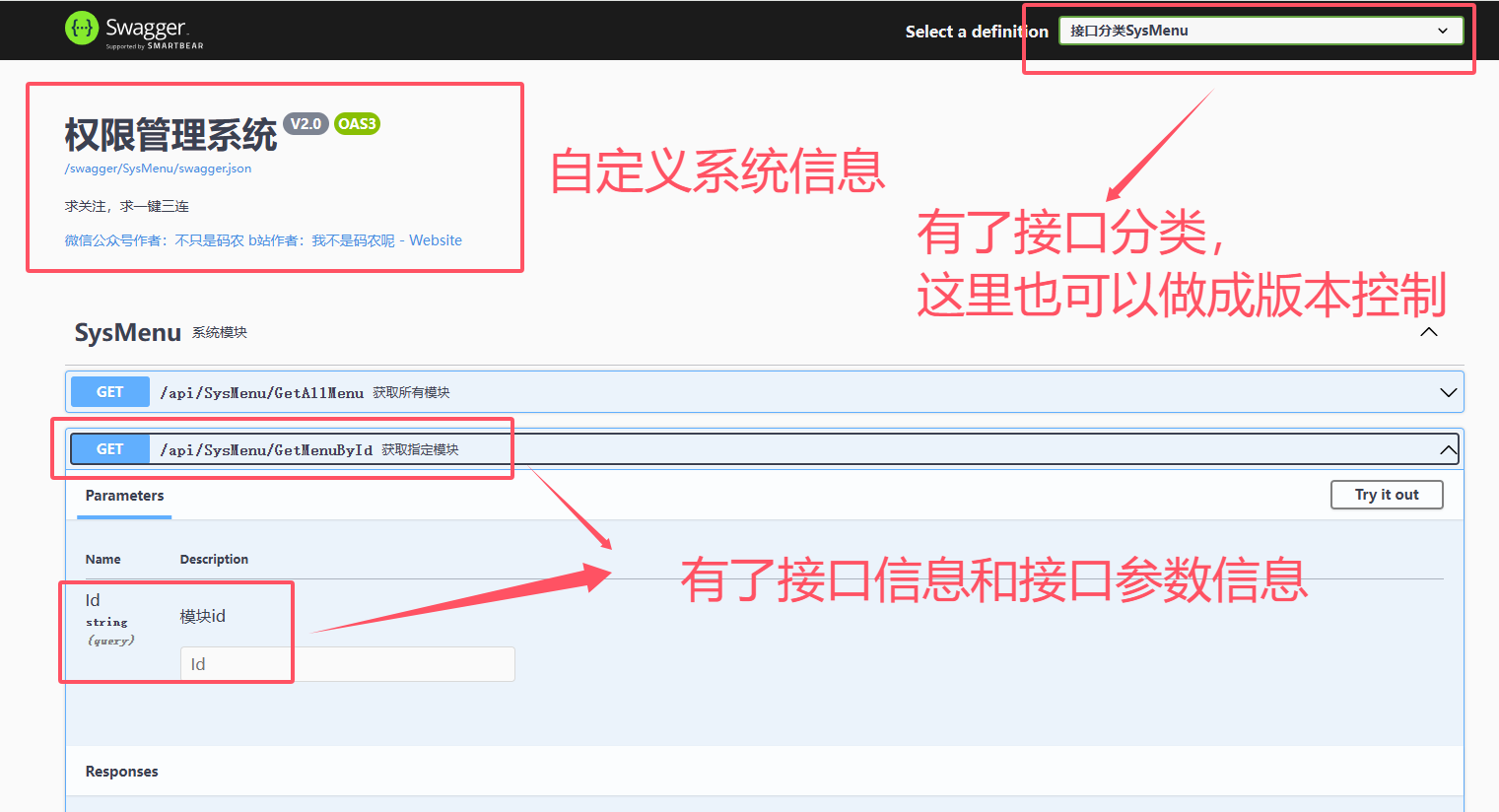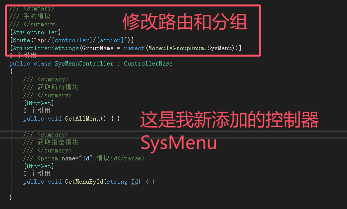 /// <summary> /// 系统模块 /// </summary> [ApiController] [Route("api/[controller]/[action]")] [ApiExplorerSettings(GroupName = nameof(ModeuleGroupEnum.SysMenu))]