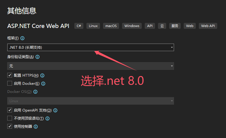 选择.net 8.0(最新长期支持版本),随后创建项目