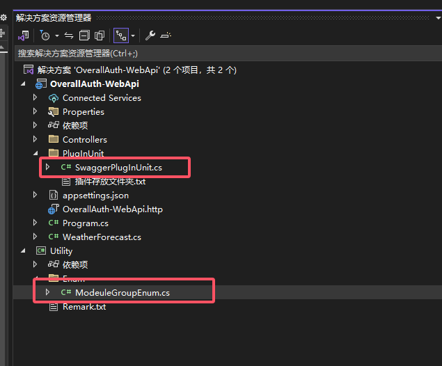 建好SwaggerPlugInUnit后,在webapi同级建一个类库Utility,用于存放系统的辅助工具等,然后再该类库下建一个Enum文件夹,并新建ModeuleGroupEnum该枚举。