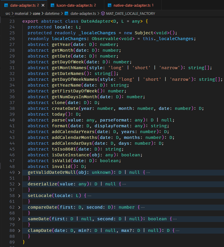 我们可以参考 LuxonDateAdapter (源码 luxon-date-adapter.ts) 和 NativeDateAdapter (源码 native-date-adapter.ts) 去实现上面这些 abstract methods。