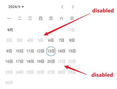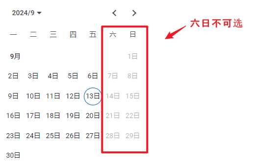 readonly dateFilterFn = signal((date: Temporal.PlainDate) => date.dayOfWeek !== 6 && date.dayOfWeek !== 7); // 星期六和星期日以外才可选