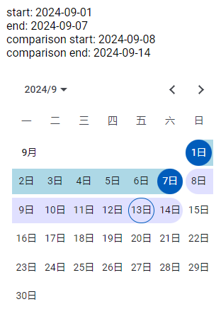 好,我们勉强来实现这个功能 -- 在同一个 Calendar 里选择 comparison date range。